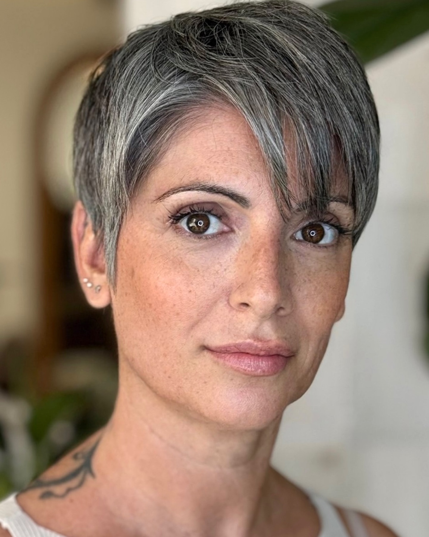 Soft feathering and long side bangs make this pixie bob flattering for the round face shape. Face-framing highlights make a huge statement, while a white blonde hue does a perfect job of blending the first gray hairs.