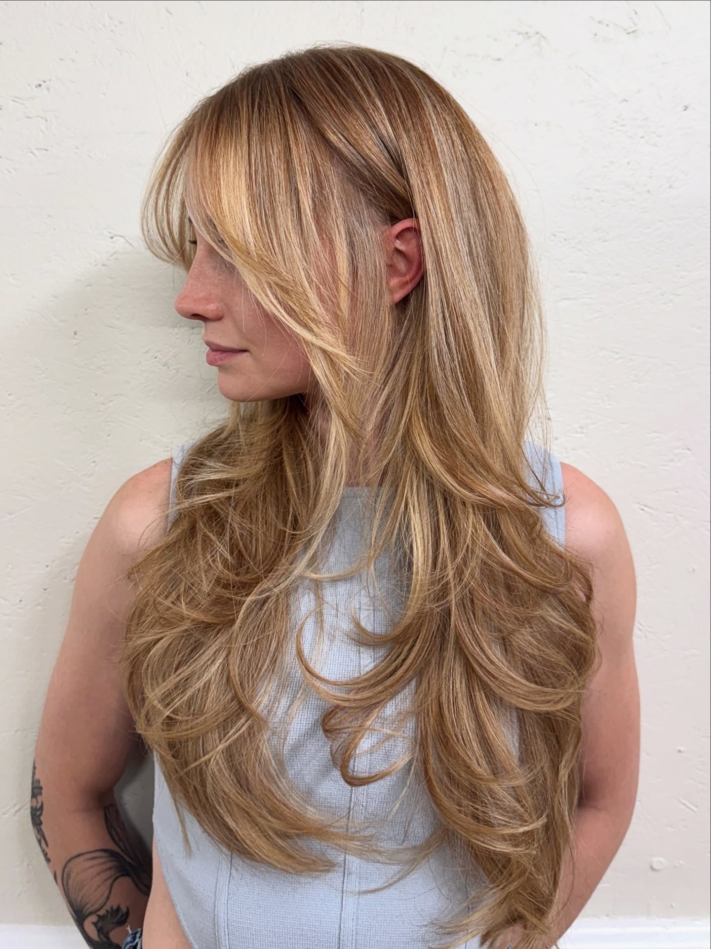 If you’re looking for a change but don’t want to sacrifice your long locks plus prefer keeping it easy-care, go for layers. They do a perfect job at creating extra volume, and face-framing fringe beautifully adds width to the longer face shape.