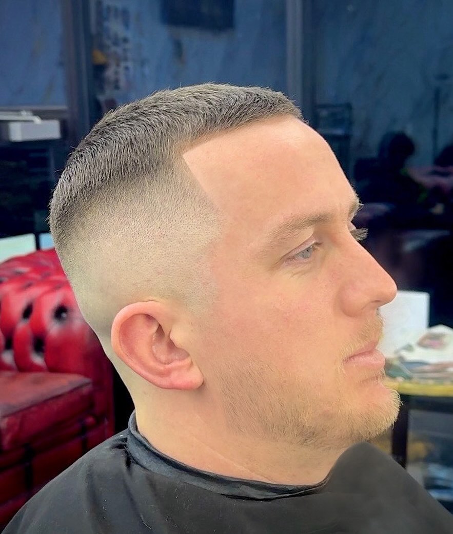 Military haircuts don’t have to follow many rules like soldiers do. You can still show off your unique personality by making a few adjustments to the classic look. Here, the barber has cut in a diagonal side part for extra definition, which is needed for such a short length.