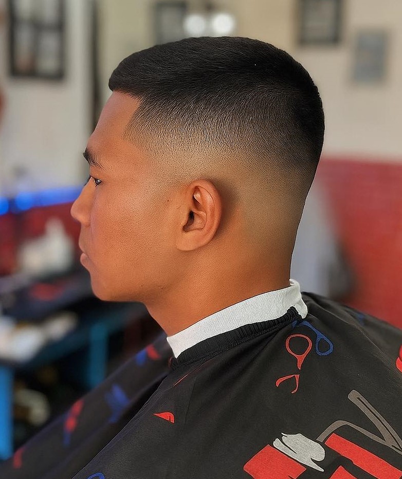 A military haircut with a flat top is a perfect example of a structured, masculine haircut that is also currently in high demand. It certainly needs coarse hair to hold that line, or you may go with a rather short length up top. You will probably want to bring this image to your barber to be sure you get what you want.
