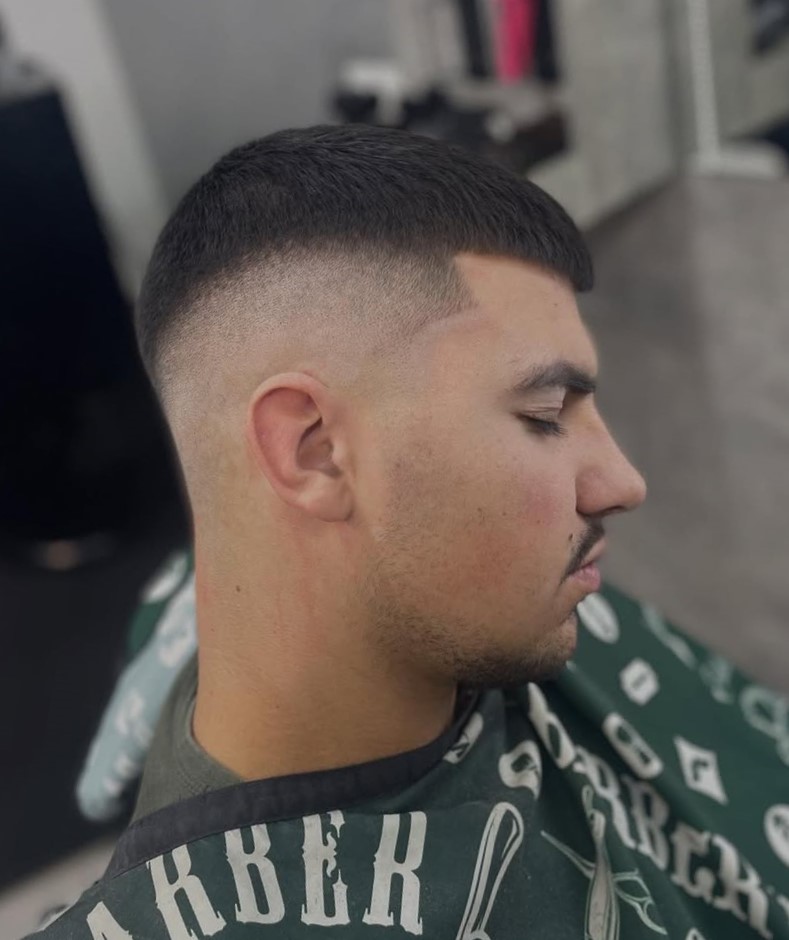 This super short haircut stays true to the style, featuring a minimal length with smoothly faded sides. If you want very short hair with a clean, disciplined edge, this cut is for you.