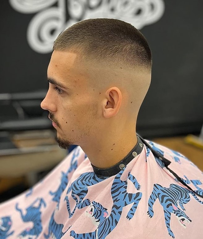 This super short haircut stays true to the style, featuring a minimal length with smoothly faded sides. If you want very short hair with a clean, disciplined edge, this cut is for you.