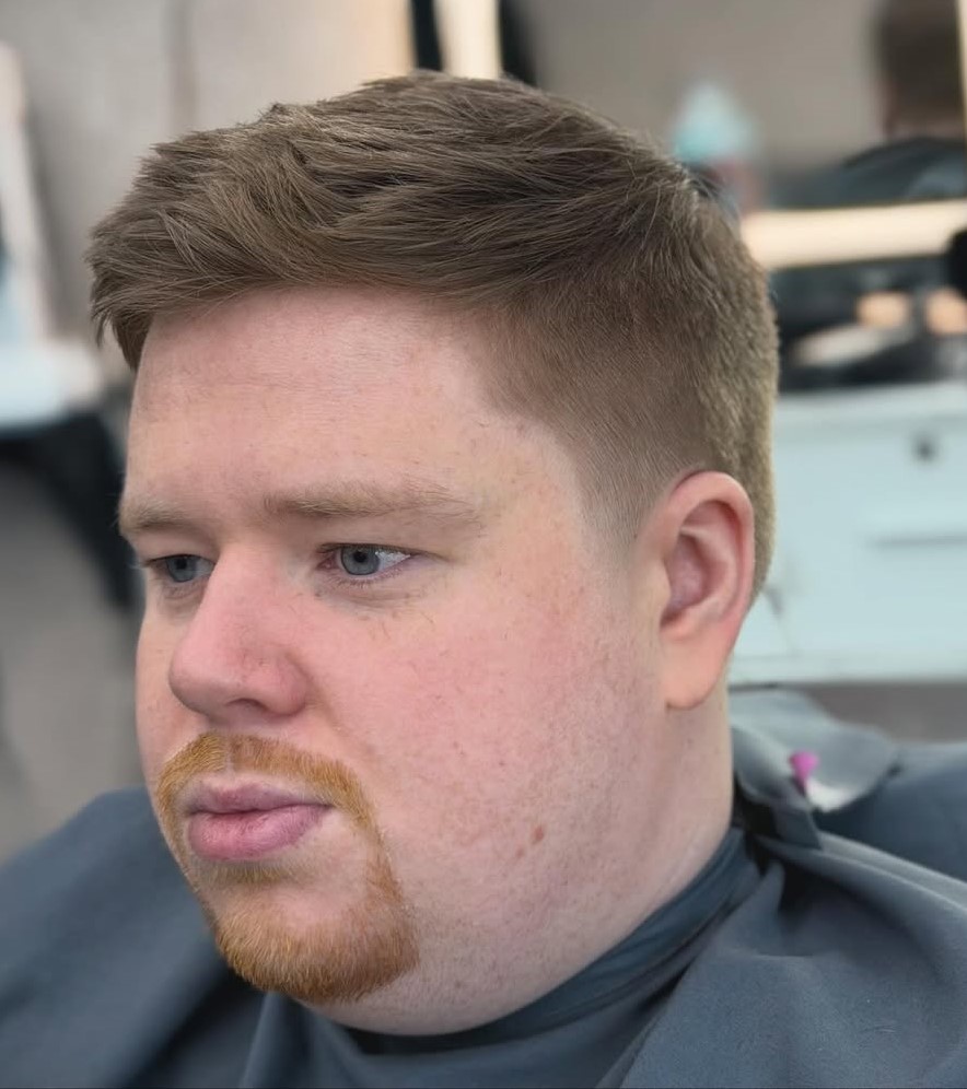 This brush cut has a faded look down and a choppier texture up top. The top is a bit longer, and it can be messy or groomed. This is a very low-maintenance cut that will not bother you – just get it trimmed up on a regular basis.