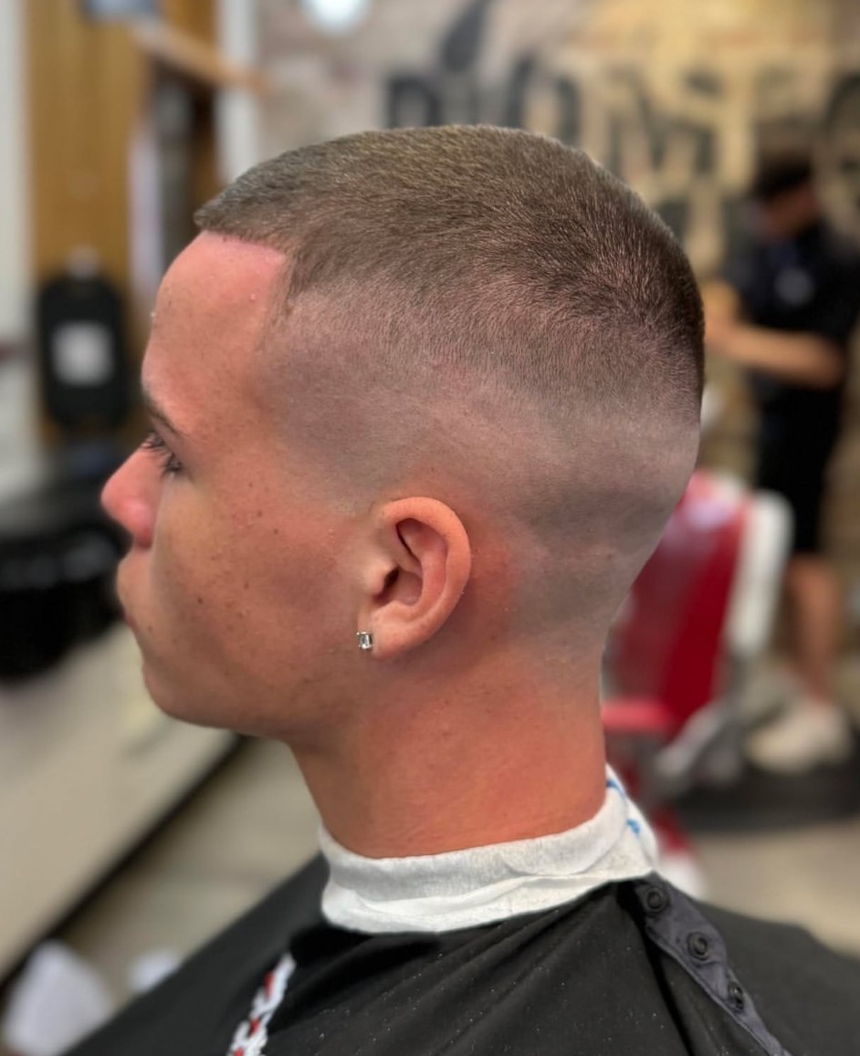 Military haircuts don’t have to follow many rules like soldiers do. You can still show off your unique personality by making a few adjustments to the classic look. Here, the barber has cut in a diagonal side part for extra definition, which is needed for such a short length.
