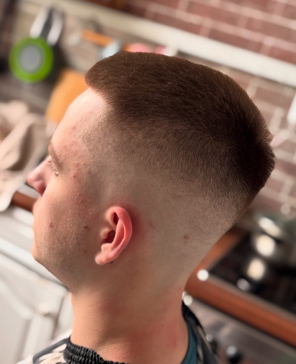 This super short haircut stays true to the style, featuring a minimal length with smoothly faded sides. If you want very short hair with a clean, disciplined edge, this cut is for you.