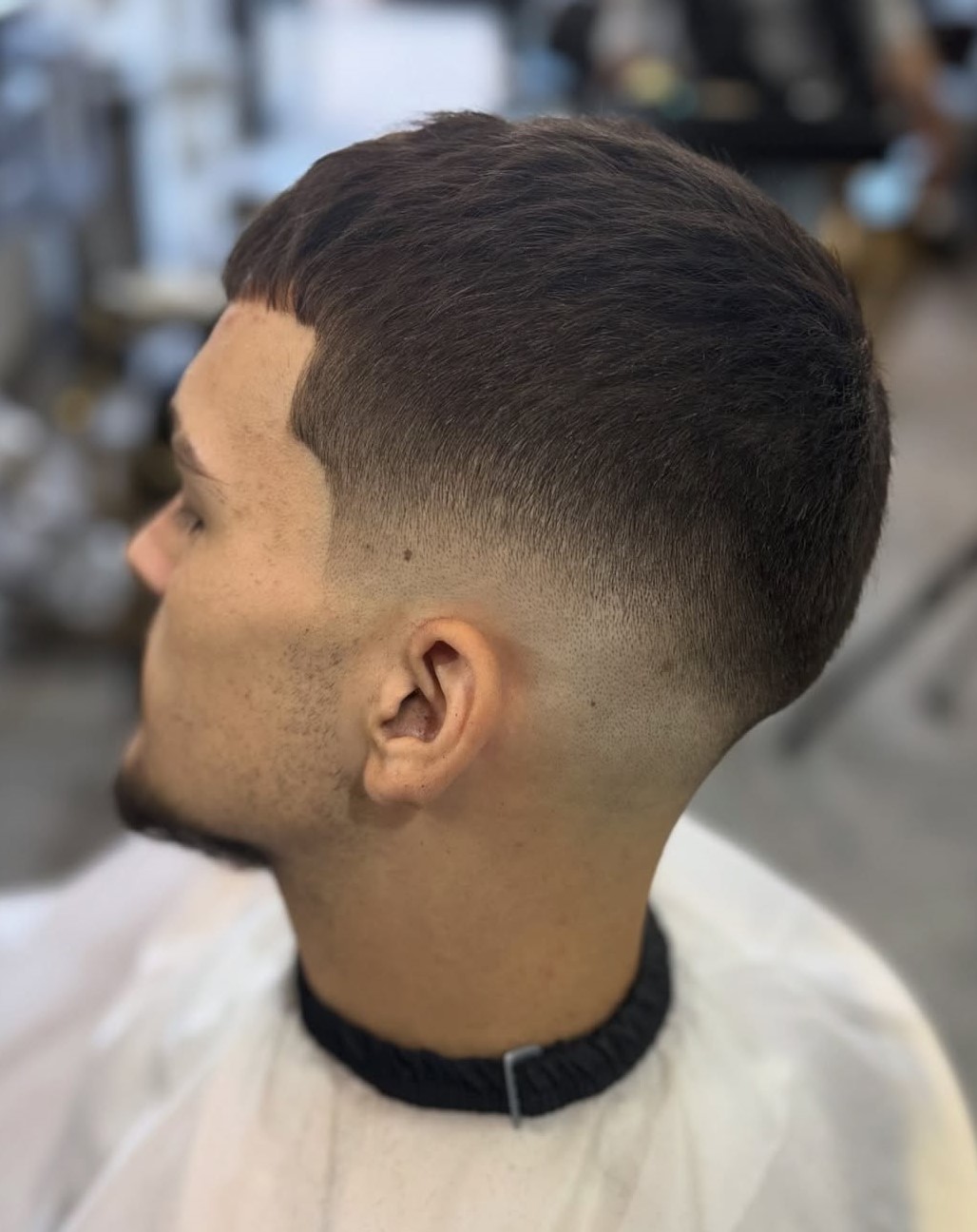 This super short haircut stays true to the style, featuring a minimal length with smoothly faded sides. If you want very short hair with a clean, disciplined edge, this cut is for you.