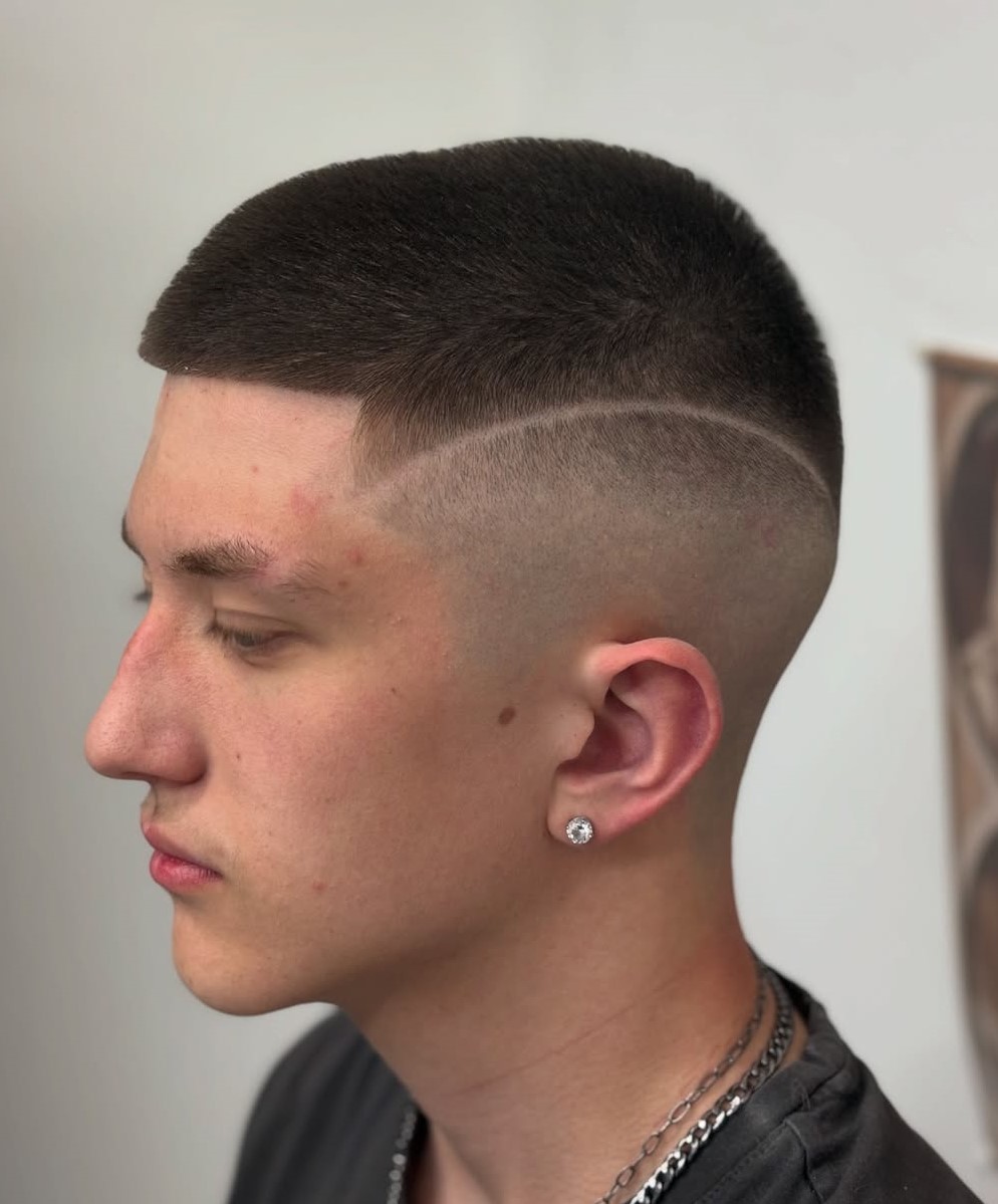 Military haircuts don’t have to follow many rules like soldiers do. You can still show off your unique personality by making a few adjustments to the classic look. Here, the barber has cut in a diagonal side part for extra definition, which is needed for such a short length.