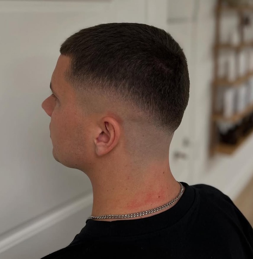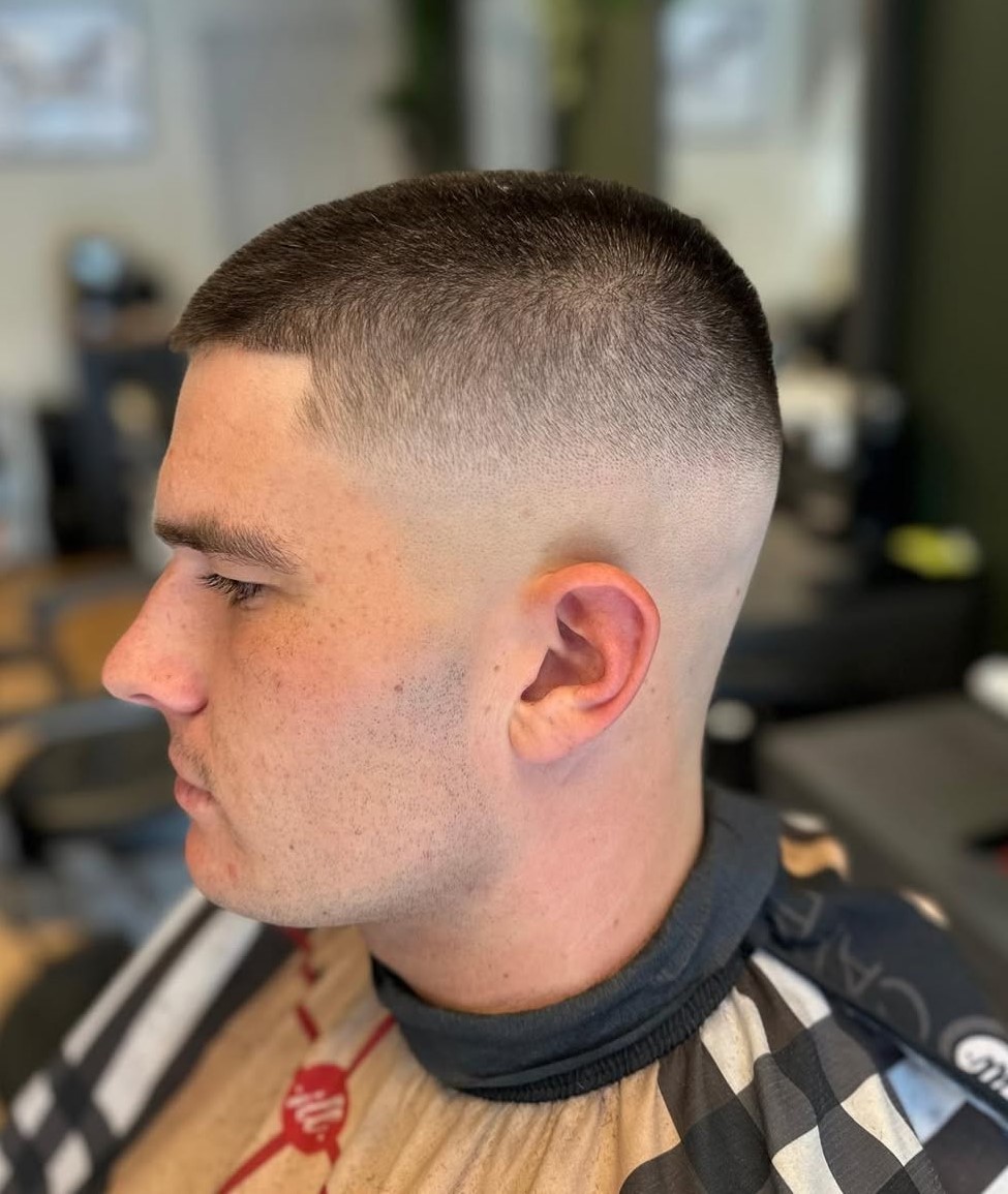 This super short haircut stays true to the style, featuring a minimal length with smoothly faded sides. If you want very short hair with a clean, disciplined edge, this cut is for you.