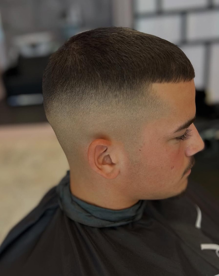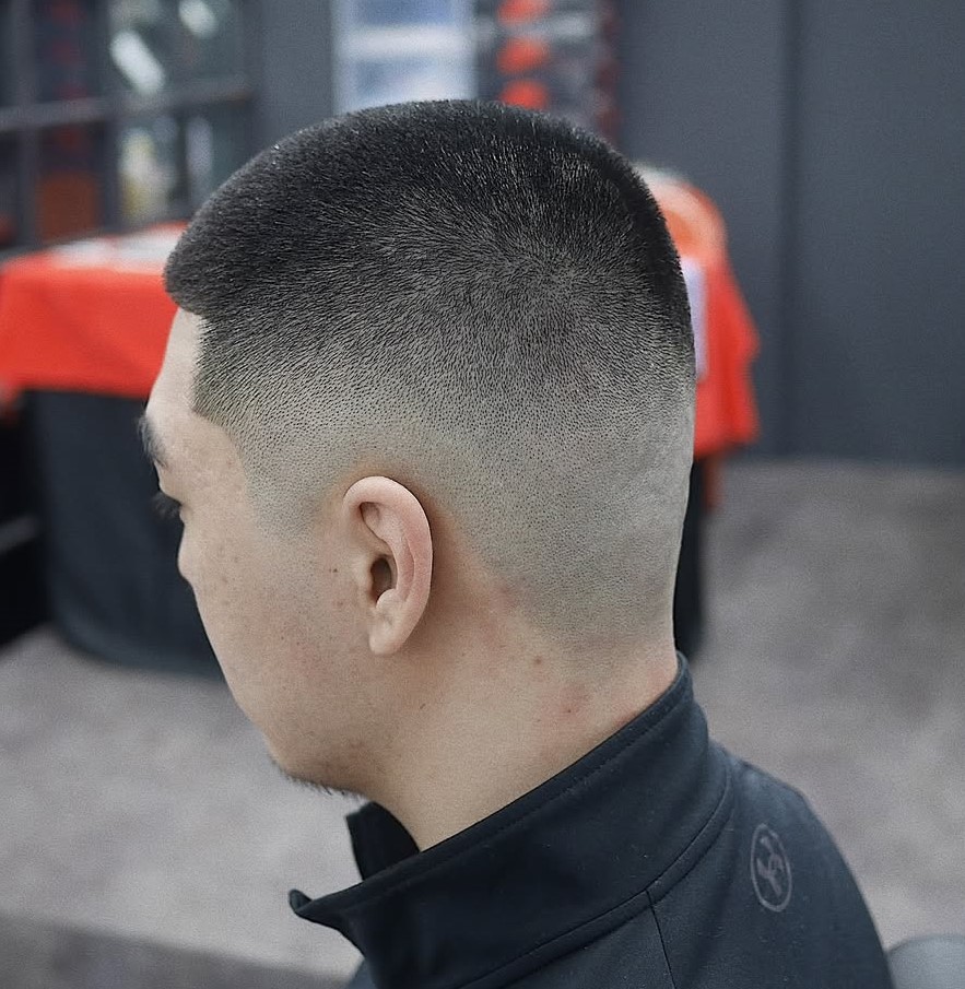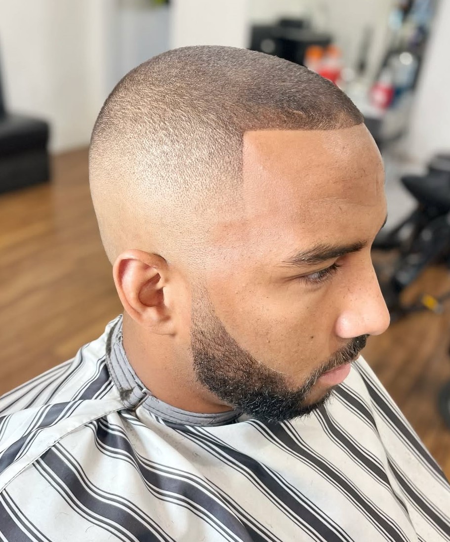 This super short haircut stays true to the style, featuring a minimal length with smoothly faded sides. If you want very short hair with a clean, disciplined edge, this cut is for you.