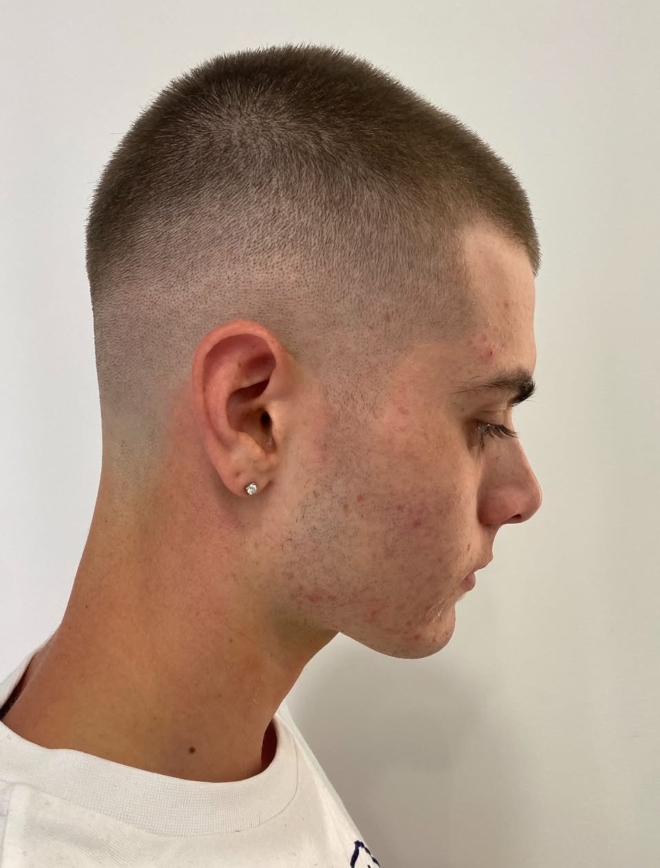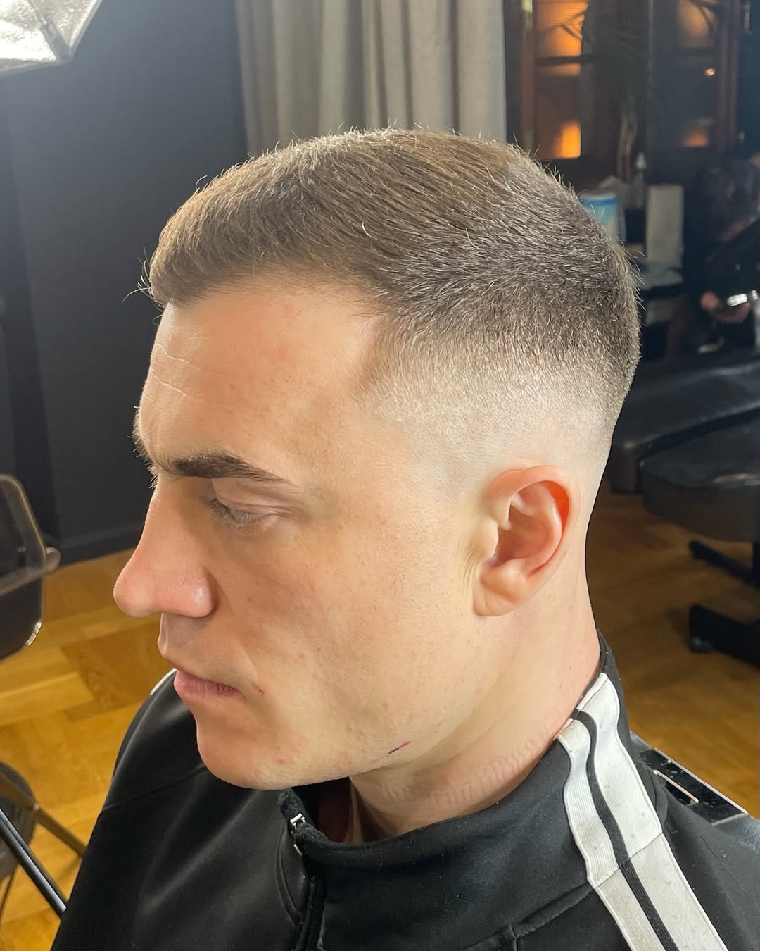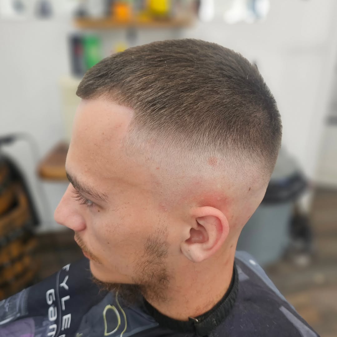 This super short haircut stays true to the style, featuring a minimal length with smoothly faded sides. If you want very short hair with a clean, disciplined edge, this cut is for you.