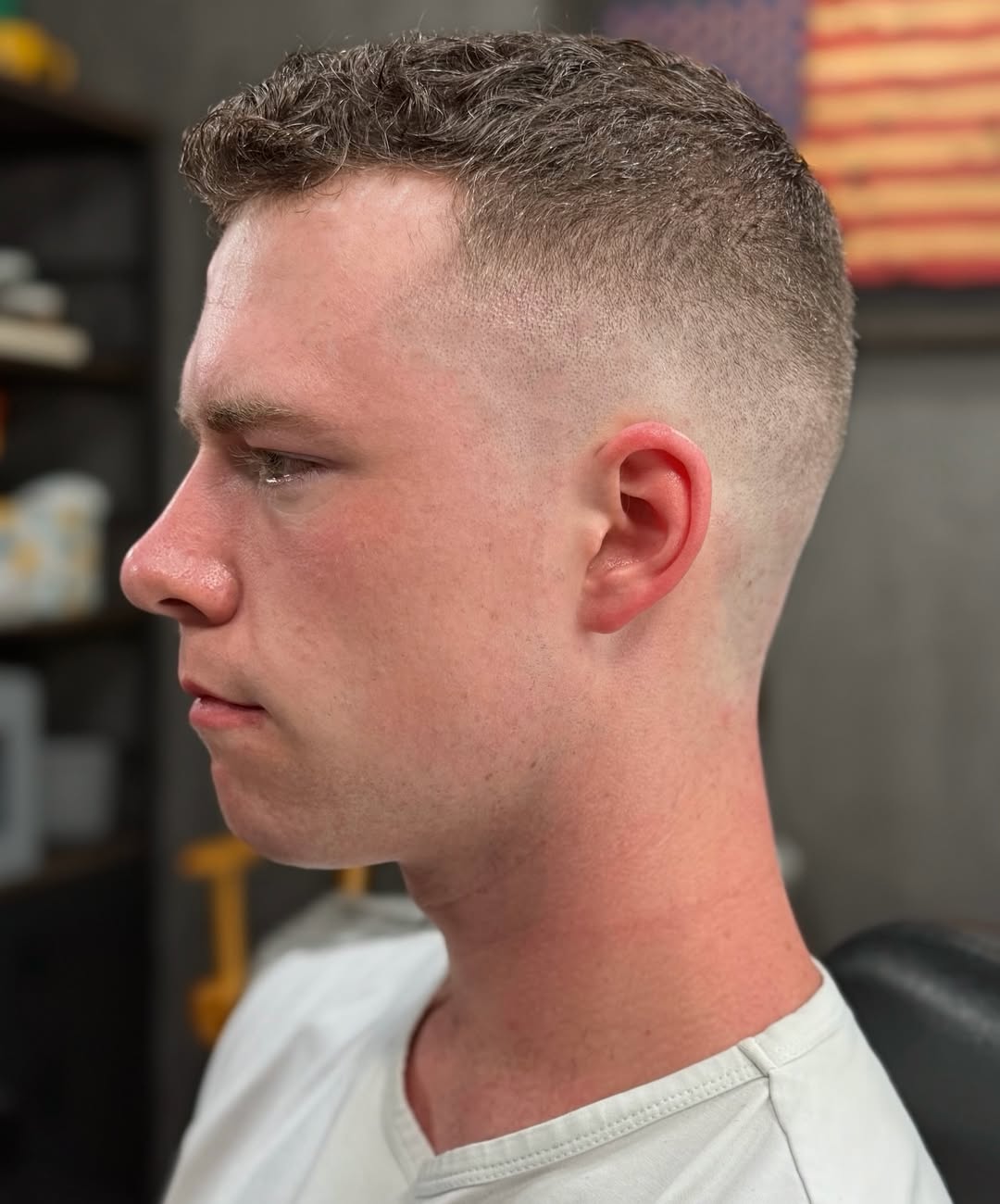A military haircut with a flat top is a perfect example of a structured, masculine haircut that is also currently in high demand. It certainly needs coarse hair to hold that line, or you may go with a rather short length up top. You will probably want to bring this image to your barber to be sure you get what you want.