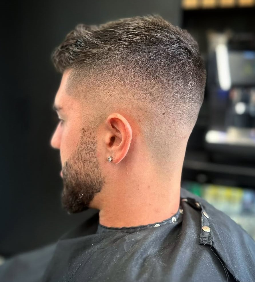 For a cut that allows you to leave a little hair on top, opt for an inch length in the quiff that is gradually tapered and faded towards the temples and nape. Ask your barber for a smooth fade that melts gradually to the skin.