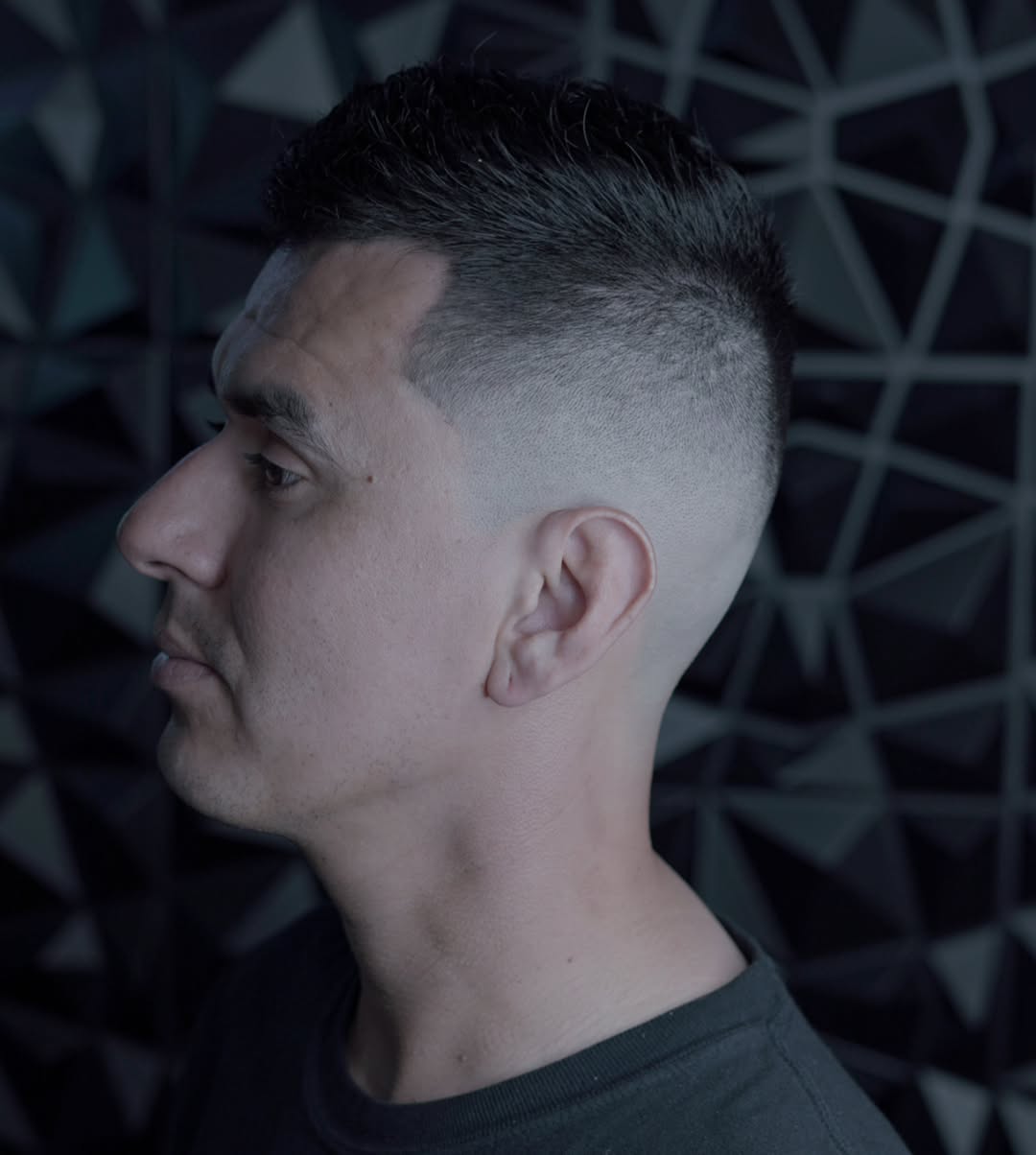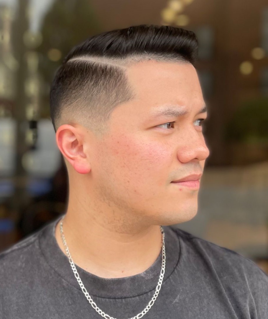 Military haircuts don’t have to follow many rules like soldiers do. You can still show off your unique personality by making a few adjustments to the classic look. Here, the barber has cut in a diagonal side part for extra definition, which is needed for such a short length.