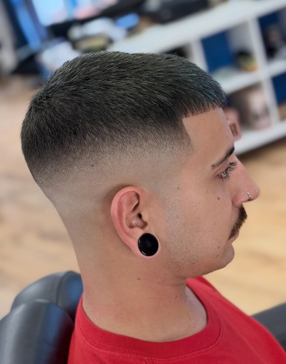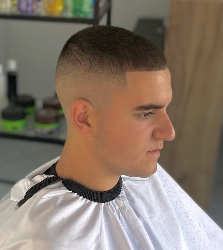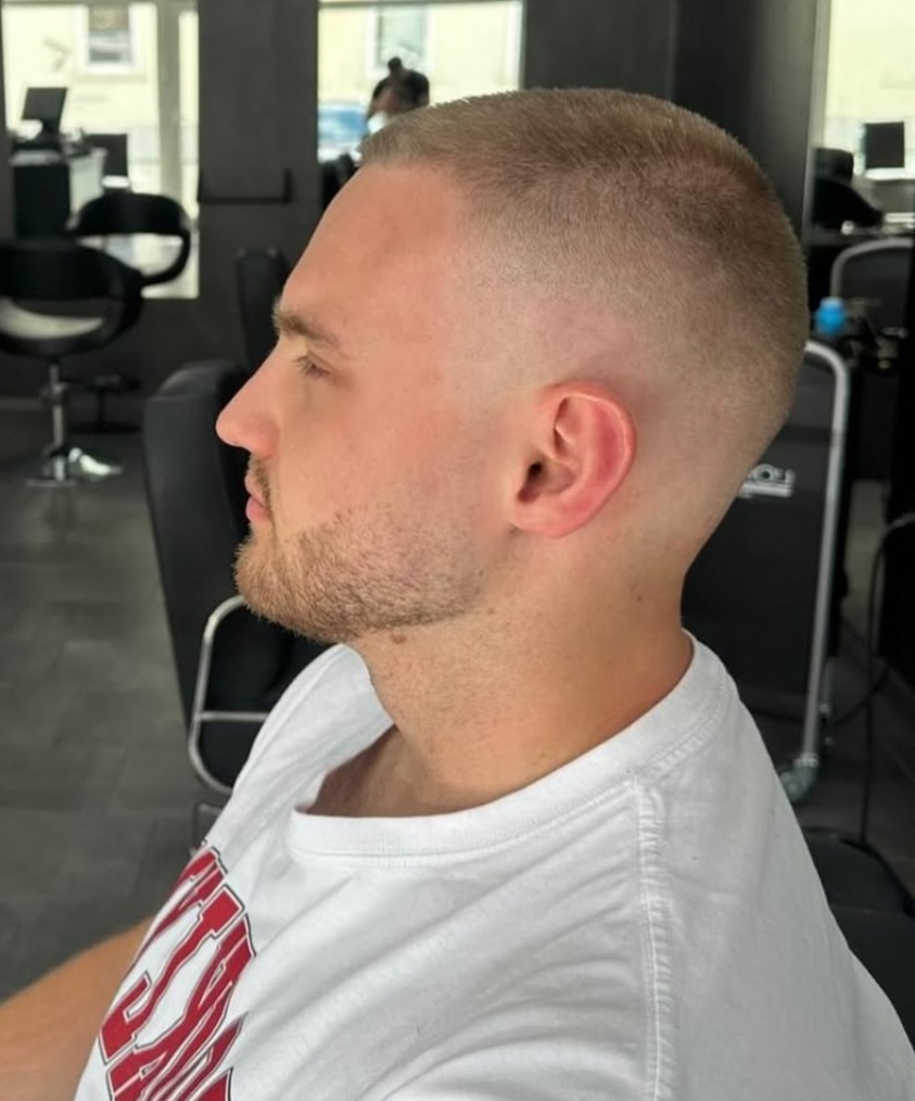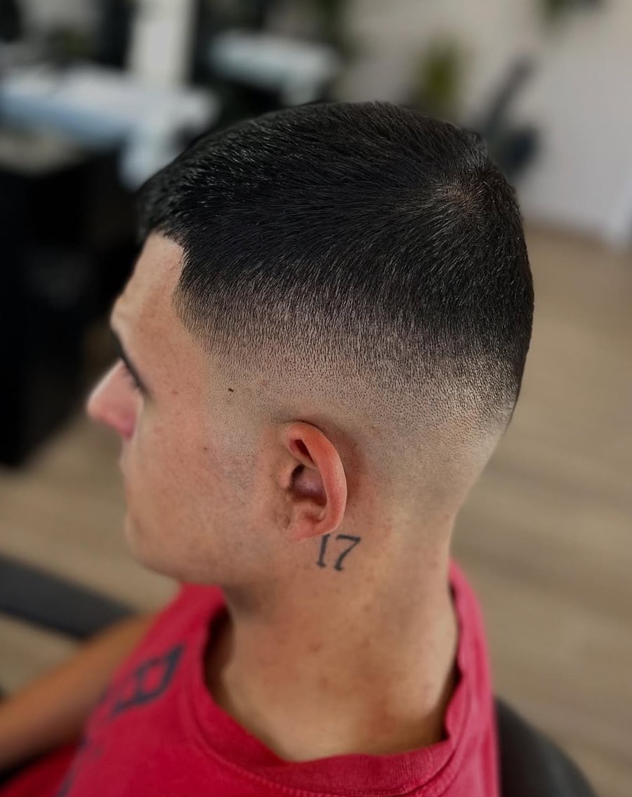 This super short haircut stays true to the style, featuring a minimal length with smoothly faded sides. If you want very short hair with a clean, disciplined edge, this cut is for you.