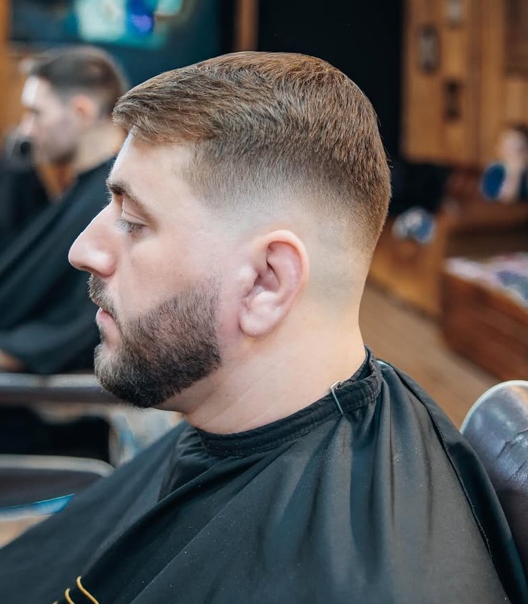 This brush cut has a faded look down and a choppier texture up top. The top is a bit longer, and it can be messy or groomed. This is a very low-maintenance cut that will not bother you – just get it trimmed up on a regular basis.