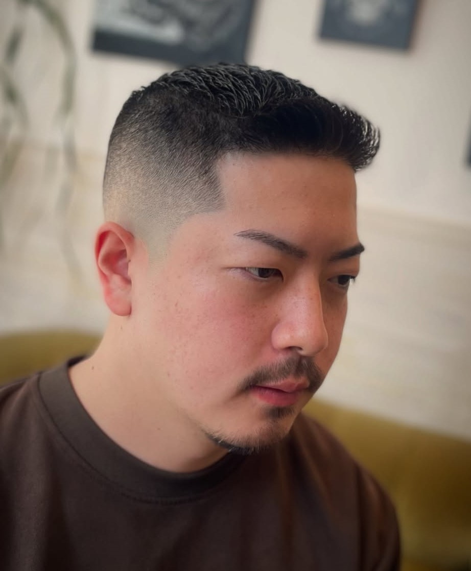 For a cut that allows you to leave a little hair on top, opt for an inch length in the quiff that is gradually tapered and faded towards the temples and nape. Ask your barber for a smooth fade that melts gradually to the skin.