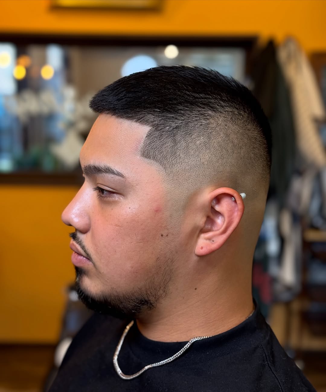 A military haircut with a flat top is a perfect example of a structured, masculine haircut that is also currently in high demand. It certainly needs coarse hair to hold that line, or you may go with a rather short length up top. You will probably want to bring this image to your barber to be sure you get what you want.