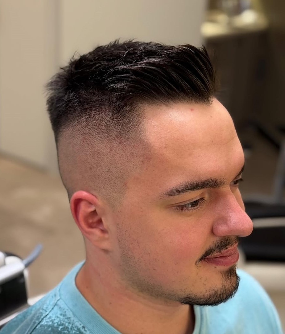 For a cut that allows you to leave a little hair on top, opt for an inch length in the quiff that is gradually tapered and faded towards the temples and nape. Ask your barber for a smooth fade that melts gradually to the skin.