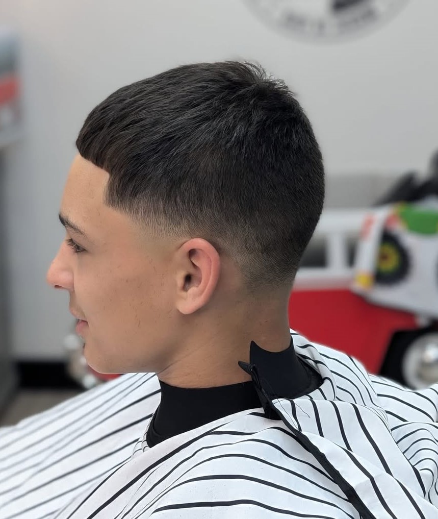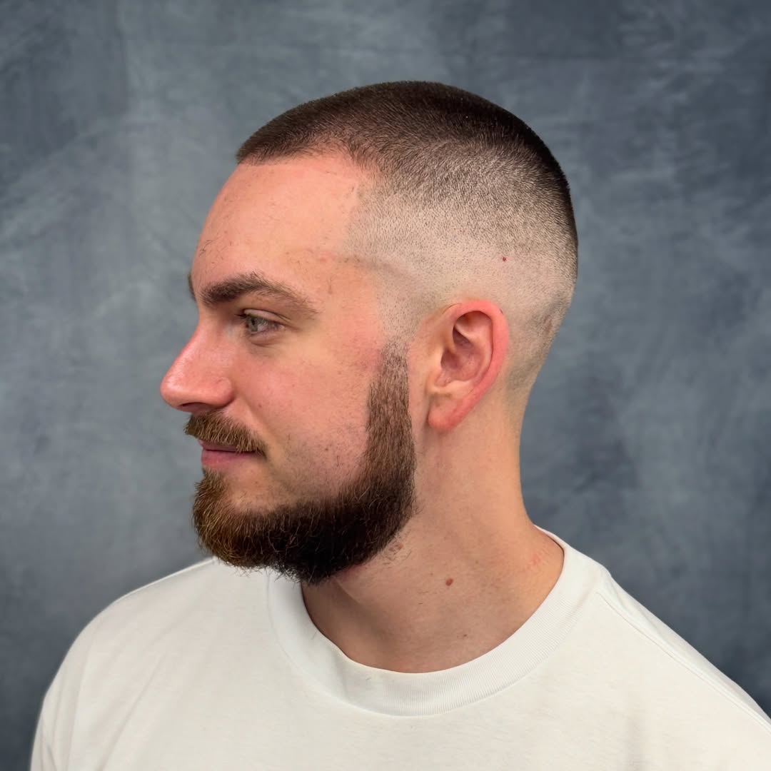 This super short haircut stays true to the style, featuring a minimal length with smoothly faded sides. If you want very short hair with a clean, disciplined edge, this cut is for you.