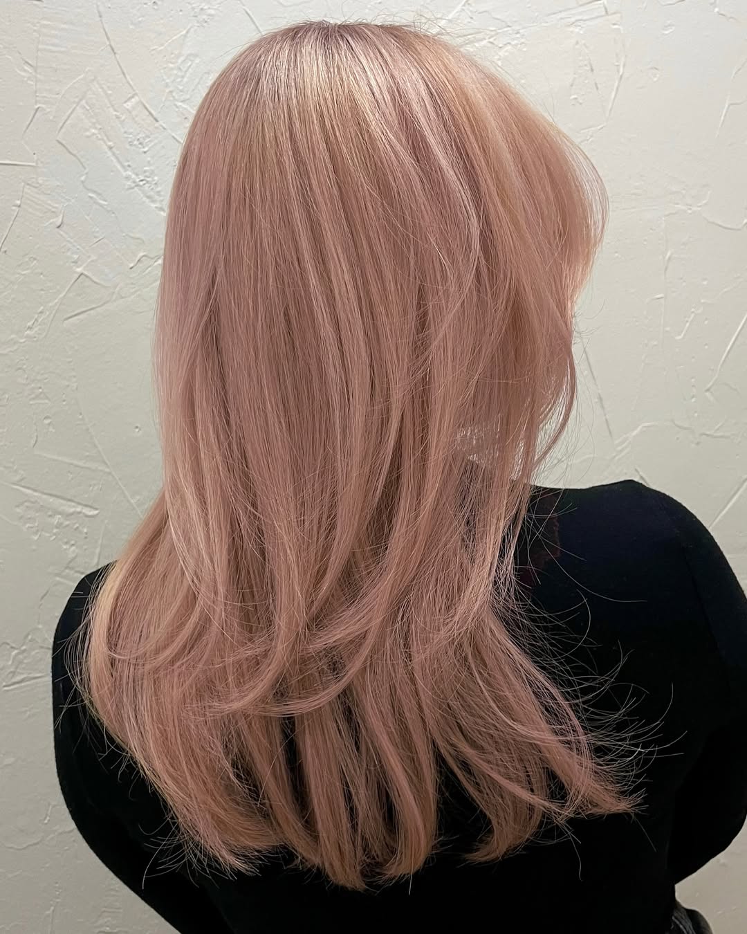 Beautiful strands of long, shiny hair fall down the back like a waterfall, and hues of pink champagne enhance the soft, ethereal quality of this hairstyle. Either perfectly straight or wavy, this color hits the mark in both cases.