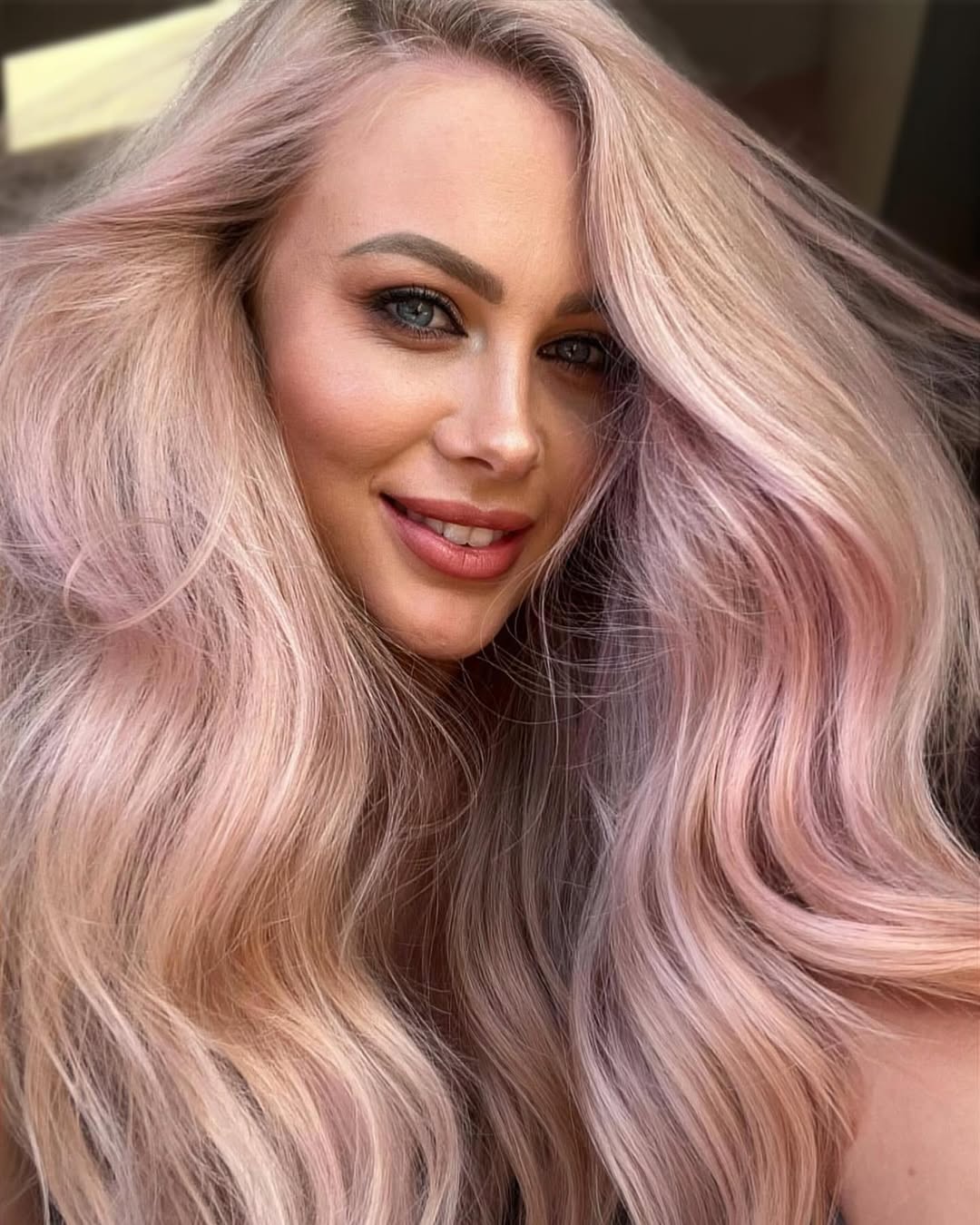 If you want to add a romantic vibe to your sandy blonde, look no further. Blush pink lowlights combined with messy waves are everything you need to upgrade your style.