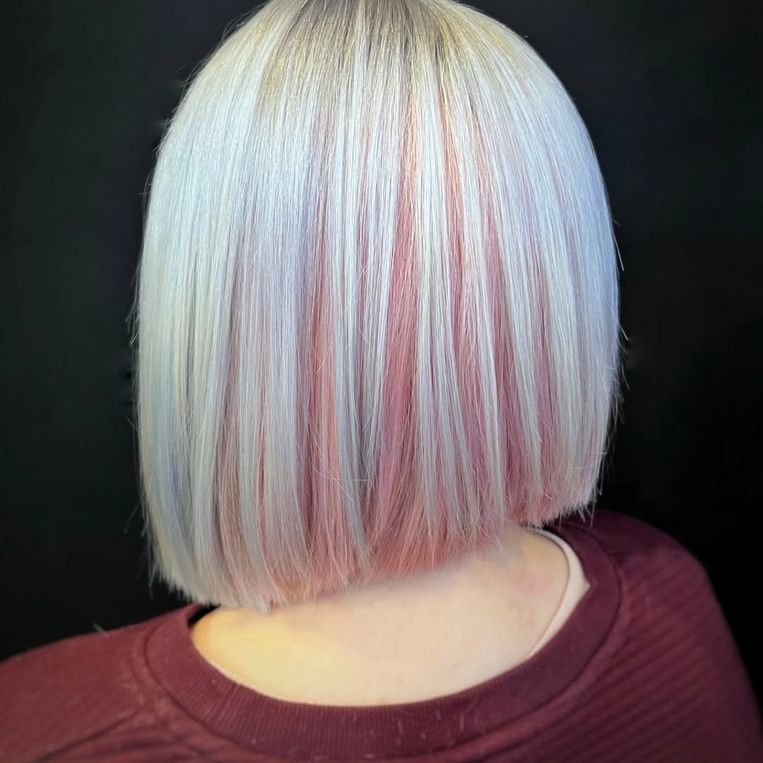These blonde strands look like they took a dip in a pool of pink milkshake! The pastel shade has a pretty softness to it. This look is really on trend and works perfectly for younger demographics looking for something fun and different.