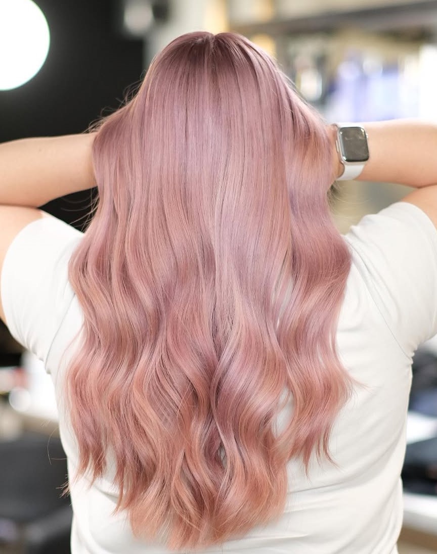 This rich mane boasts a multitude of rose gold shades paired with loose waves to create a striking combination, while dark roots provide a cool but not harsh contrast. A perfect solution to elevate the beauty of long hair.