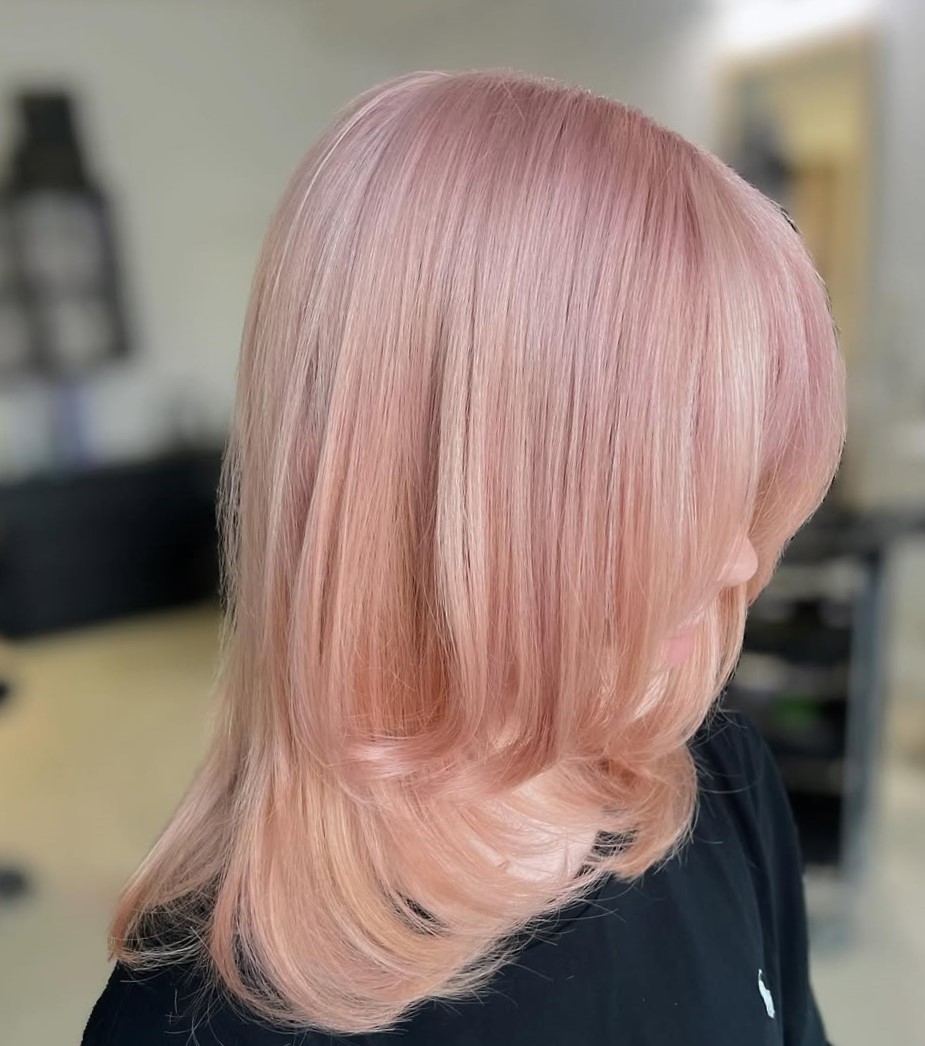 These silky straight strands are ice-cream colored – all they need is a cherry on top. Indulge in this heavenly peachy pink hue from roots to tips and incorporate a scattering of subtle lowlights into the mix for a dimensional effect.