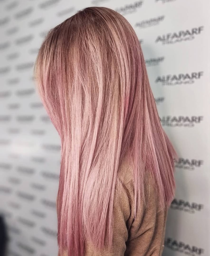 Beautiful strands of long, shiny hair fall down the back like a waterfall, and hues of pink champagne enhance the soft, ethereal quality of this hairstyle. Either perfectly straight or wavy, this color hits the mark in both cases.