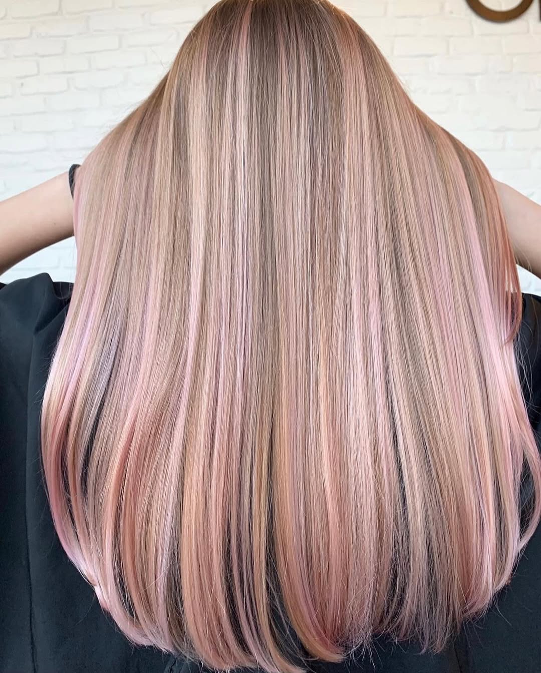 These silky straight strands are ice-cream colored – all they need is a cherry on top. Indulge in this heavenly peachy pink hue from roots to tips and incorporate a scattering of subtle lowlights into the mix for a dimensional effect.