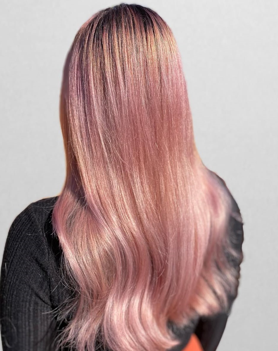 This rich mane boasts a multitude of rose gold shades paired with loose waves to create a striking combination, while dark roots provide a cool but not harsh contrast. A perfect solution to elevate the beauty of long hair.