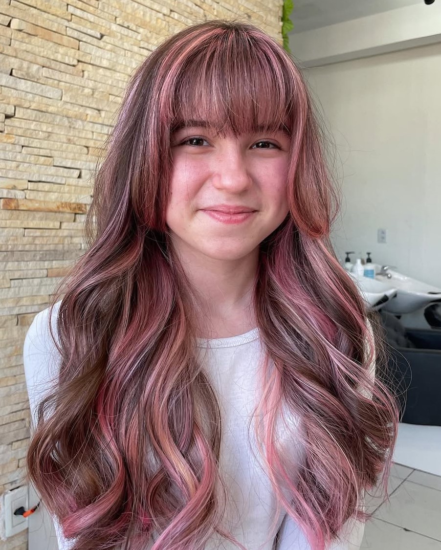 Warm pink highlights work well as accent pieces combined with a reddish-brown base. This striking color work also embraces a beautiful caramel balayage. It may sound like a lot of colors for one head of hair, but it is still cohesive.