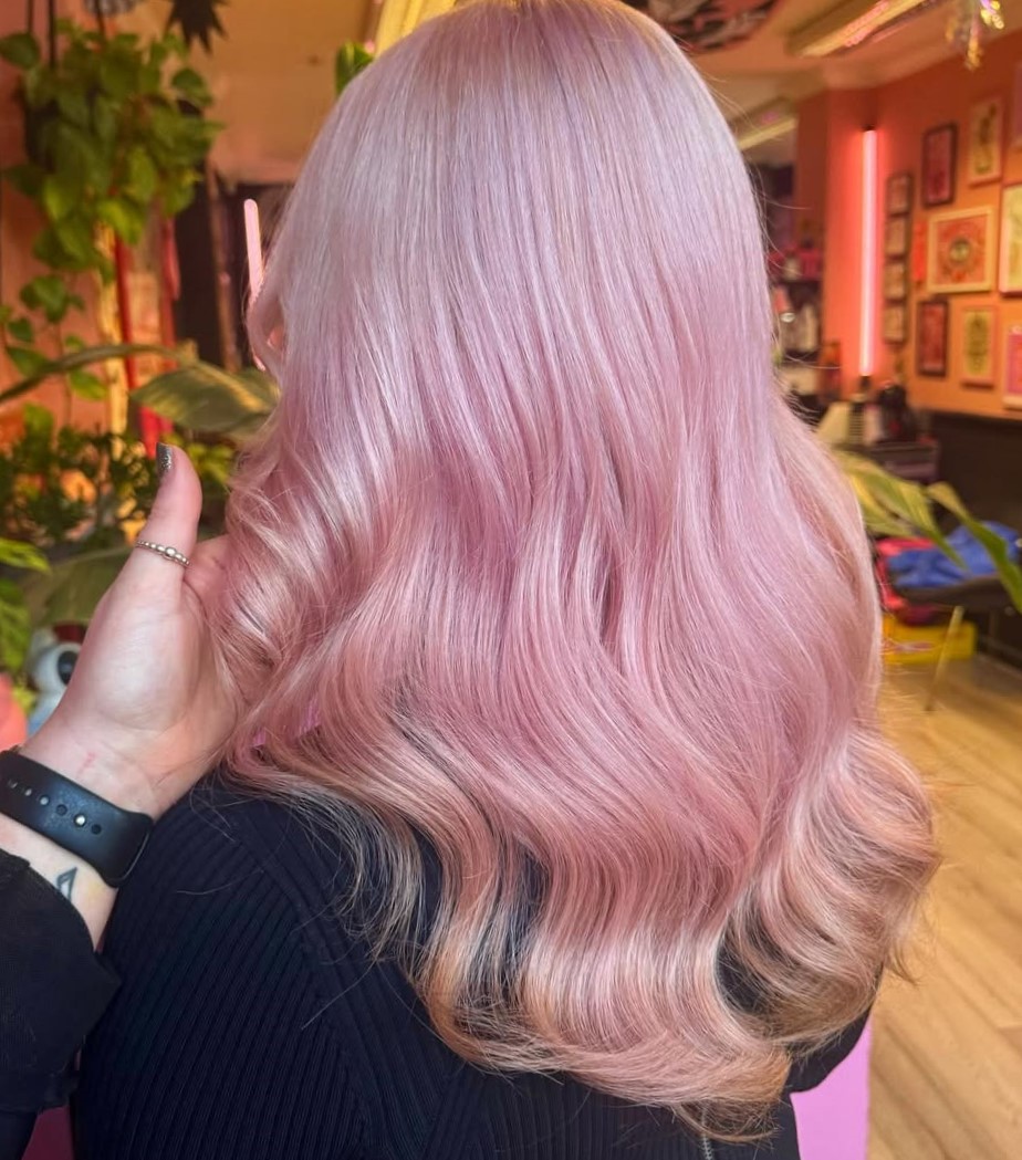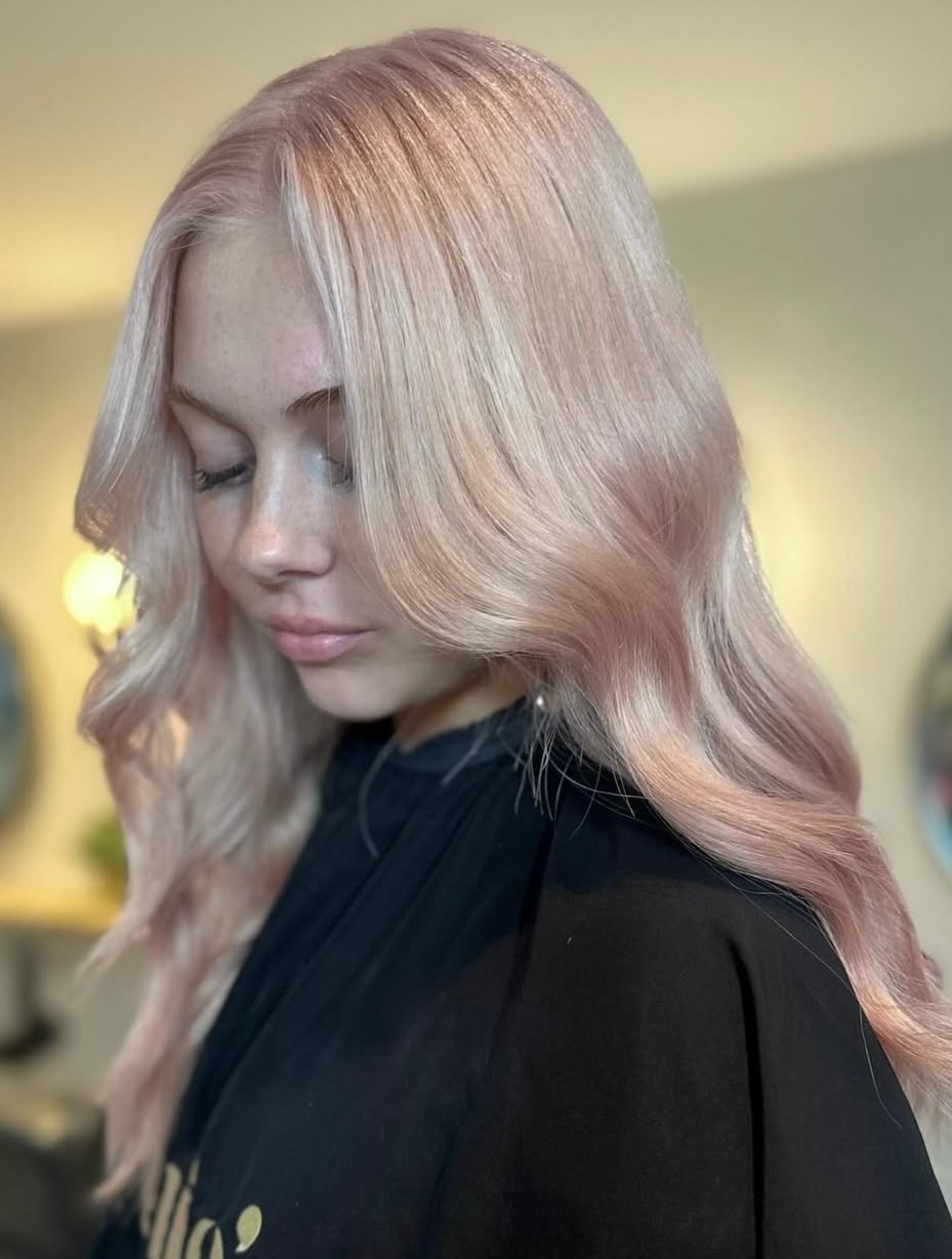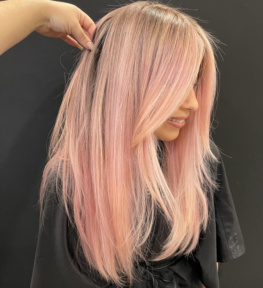 These blonde strands look like they took a dip in a pool of pink milkshake! The pastel shade has a pretty softness to it. This look is really on trend and works perfectly for younger demographics looking for something fun and different.