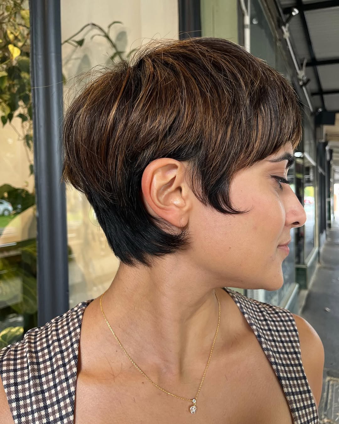 A winning element of pixie haircuts for round faces is tight sides that visually elongate the head. If you don’t mind turning heads, opt for shaved sides and balance the look with feminine soft layers on top.