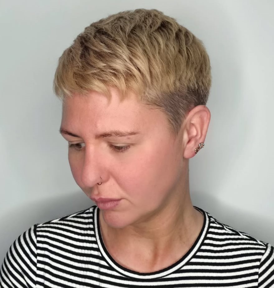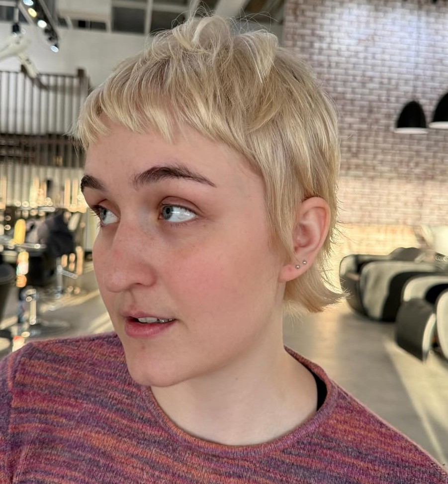 Pixies can go as urban and modern as you dare. Short blonde hair and curtain bang trends aren’t going anywhere soon. Keep the roots darkened for interest and dimension.