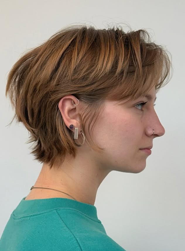 Shaggy haircuts with messy wispy layers are a surefire way to hit a trendy, attractive look. Plus, choppy layers are a great tool your stylist can use to customize the cut to the round face shape. This version of a pixie is truly effortless and dreamy.
