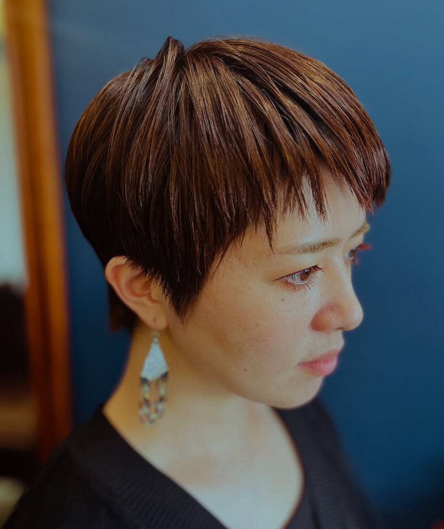 This is so adorable! Part pixie, part bowl cut, the imperfect styling reveals a spunky personality. Ask your stylist for blunt cut bangs, cute short sideburns and longer hair tousled on top. When hair is short, your face becomes the star, so experiment with fun, colorful makeup.