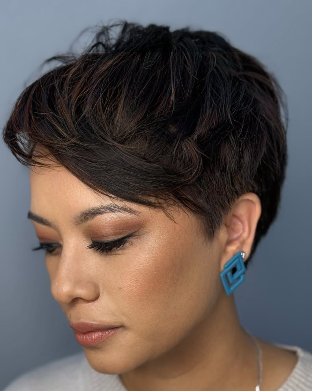 Typically, pixies are styled forward. But they can also be swept back, whether for a formal evening or just as your everyday look. A long crop is especially chic when blown or brushed back. You’ll want to employ a light hold spray to keep hair in place without added stiffness.
