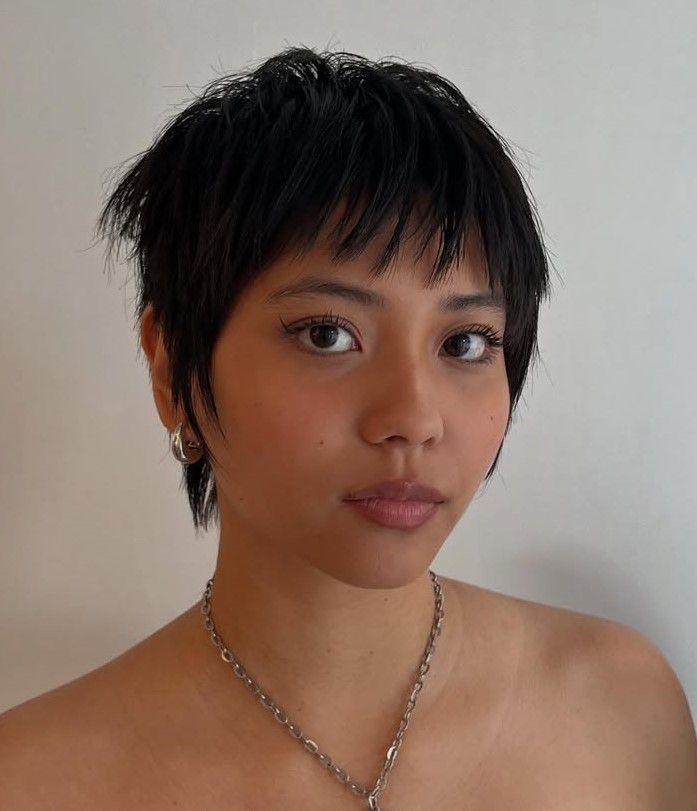 This is so adorable! Part pixie, part bowl cut, the imperfect styling reveals a spunky personality. Ask your stylist for blunt cut bangs, cute short sideburns and longer hair tousled on top. When hair is short, your face becomes the star, so experiment with fun, colorful makeup.