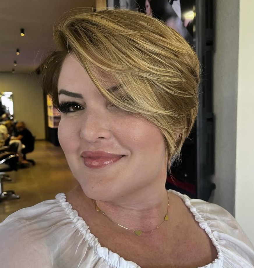 For a cute look that will turn heads, opt for a messy, short pixie with a flattering color woven through. While it’s tempting to pick your favorite color, you’re better off consulting your closet. In front of a mirror, hold up different pieces of material to your face to see what makes your eyes and smile stand out.
