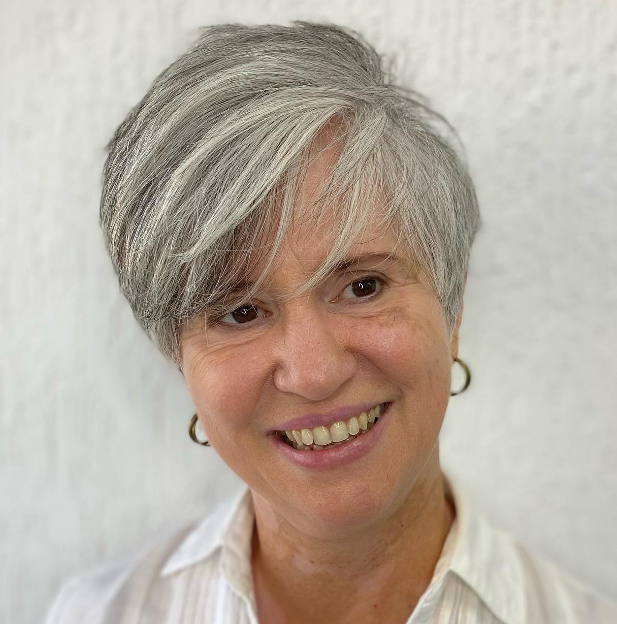 Show off your silver-gray locks by feathering them out towards the back in a wedge shape. Pixie hairstyles for women over 50 are sassy and feminine, and can be styled in a multitude of ways. Change the part; comb it straight down and forward, or slick it back – there’s no shortage of options for everyday wear.