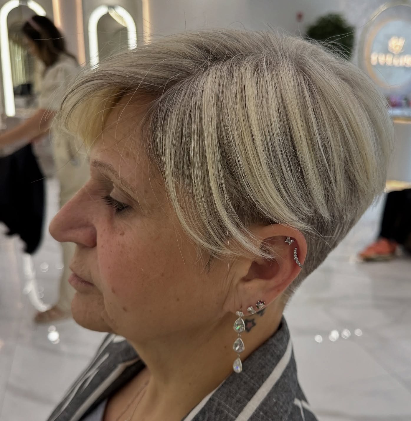 Also, rethink your color and styling. Balayage and two-toned colorings can help brighten the complexion. If you have transitioned to your natural gray, consider enhancing it with silver blonde highlights or dark gray lowlights. When it comes to styling, defined layers, as well as a spiky or swept-back top, work like magic. Check the images with short crops below and save the ideas you love the most.