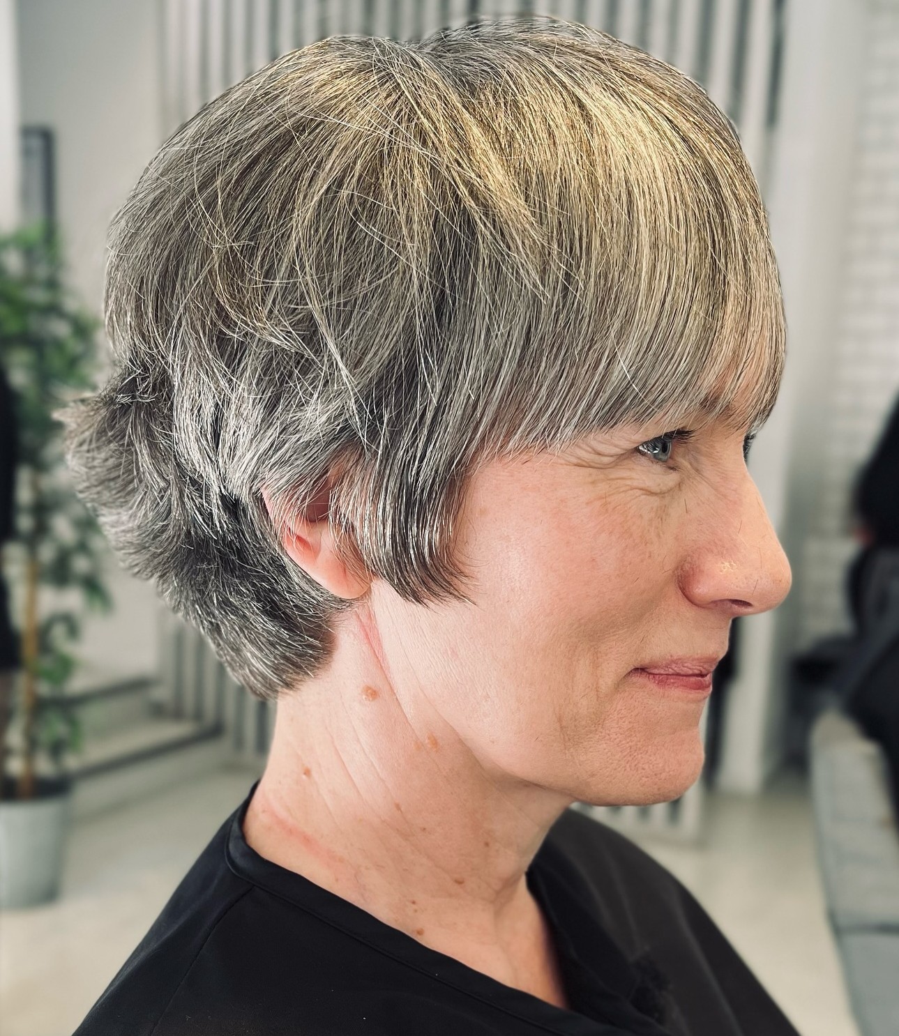 Show off your silver-gray locks by feathering them out towards the back in a wedge shape. Pixie hairstyles for women over 50 are sassy and feminine, and can be styled in a multitude of ways. Change the part; comb it straight down and forward, or slick it back – there’s no shortage of options for everyday wear.