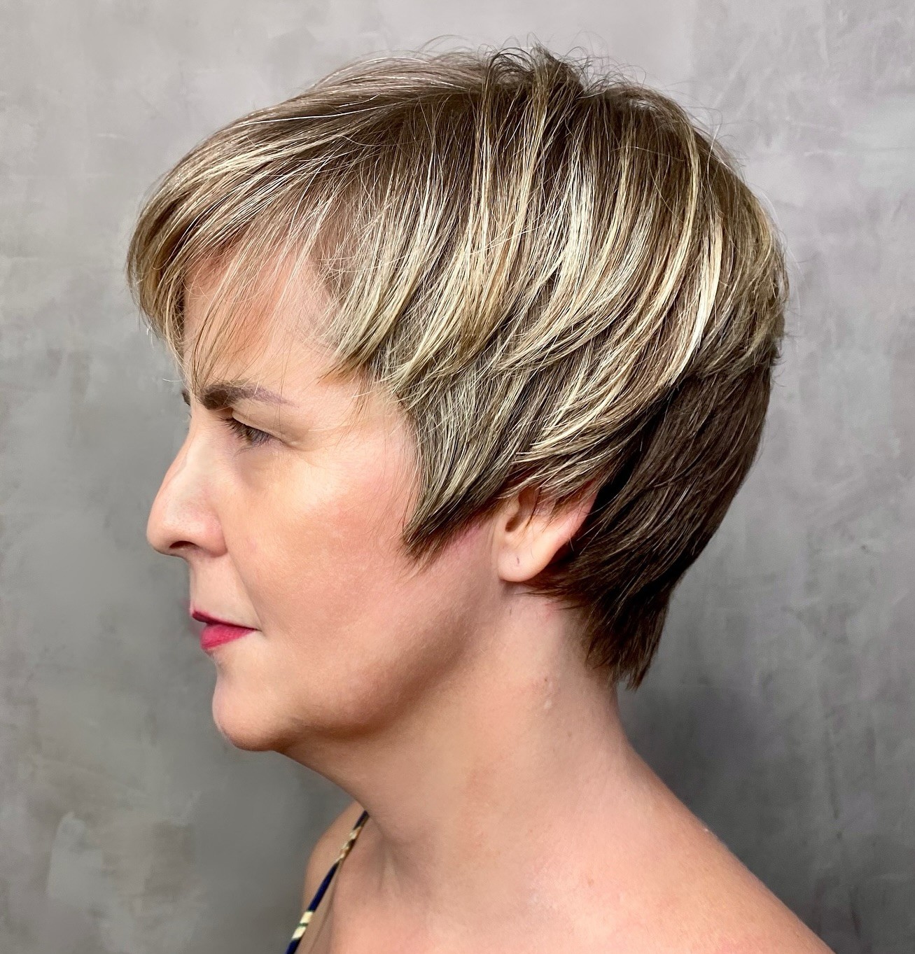 Also, rethink your color and styling. Balayage and two-toned colorings can help brighten the complexion. If you have transitioned to your natural gray, consider enhancing it with silver blonde highlights or dark gray lowlights. When it comes to styling, defined layers, as well as a spiky or swept-back top, work like magic. Check the images with short crops below and save the ideas you love the most.