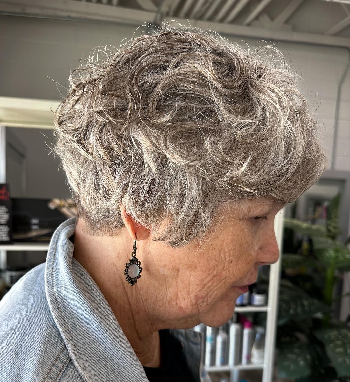 A tousled top and a tapered back are the mainstays of well-structured pixies because this combo is youthful and easy to style. The long, silver-gray highlights can match in color with your frames and help to make a fashion statement.