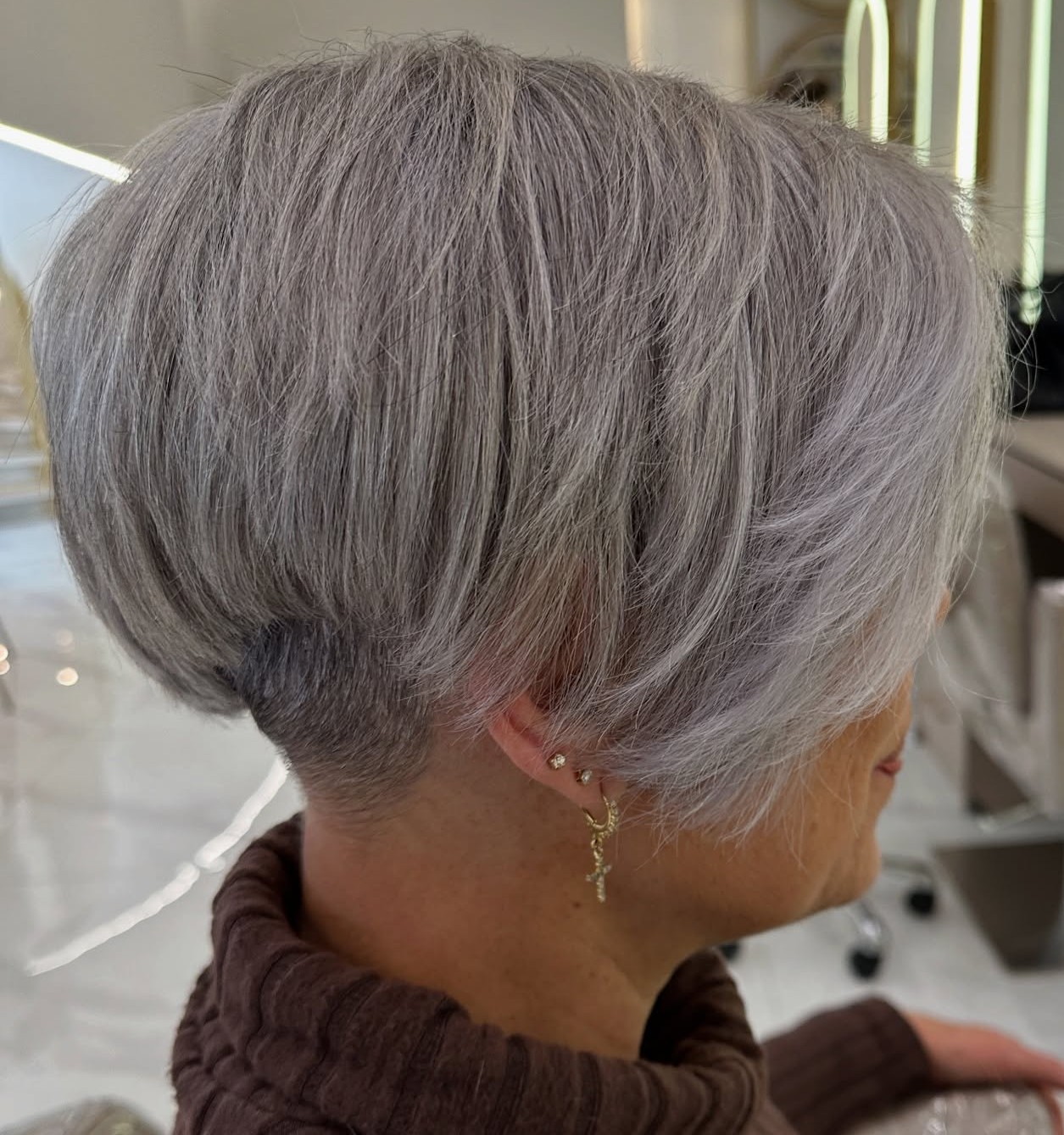 Let your pixie haircut grow out gracefully by keeping the back section trimmed close to the nape and letting the crown section go a bit longer. For thick hair, make sure to cut the bangs on an angle, so they lie flat and frame your forehead and eyes. The silver-gray balayage combines nicely with dark brown and blonde hair.