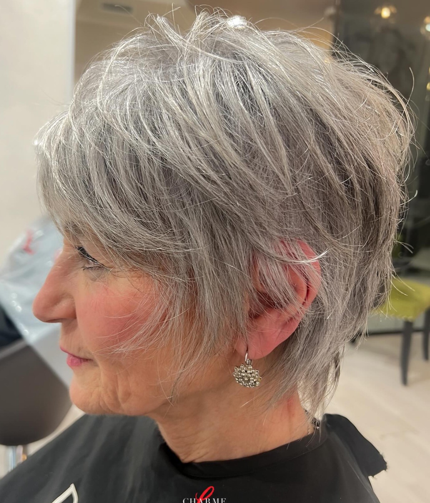 A tousled top and a tapered back are the mainstays of well-structured pixies because this combo is youthful and easy to style. The long, silver-gray highlights can match in color with your frames and help to make a fashion statement.