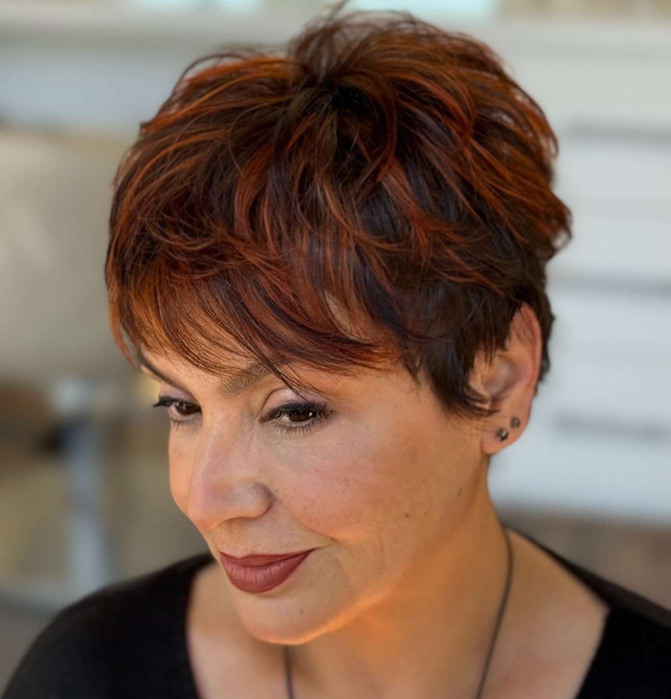 The uneven layers of this bright, wavy pixie cut give a very youthful look. The dramatic rusty red tones of the copper balayage show an awareness of the latest fashion and beauty trends. The extra-long curly pieces that drape over the eyes add flair and individual style.