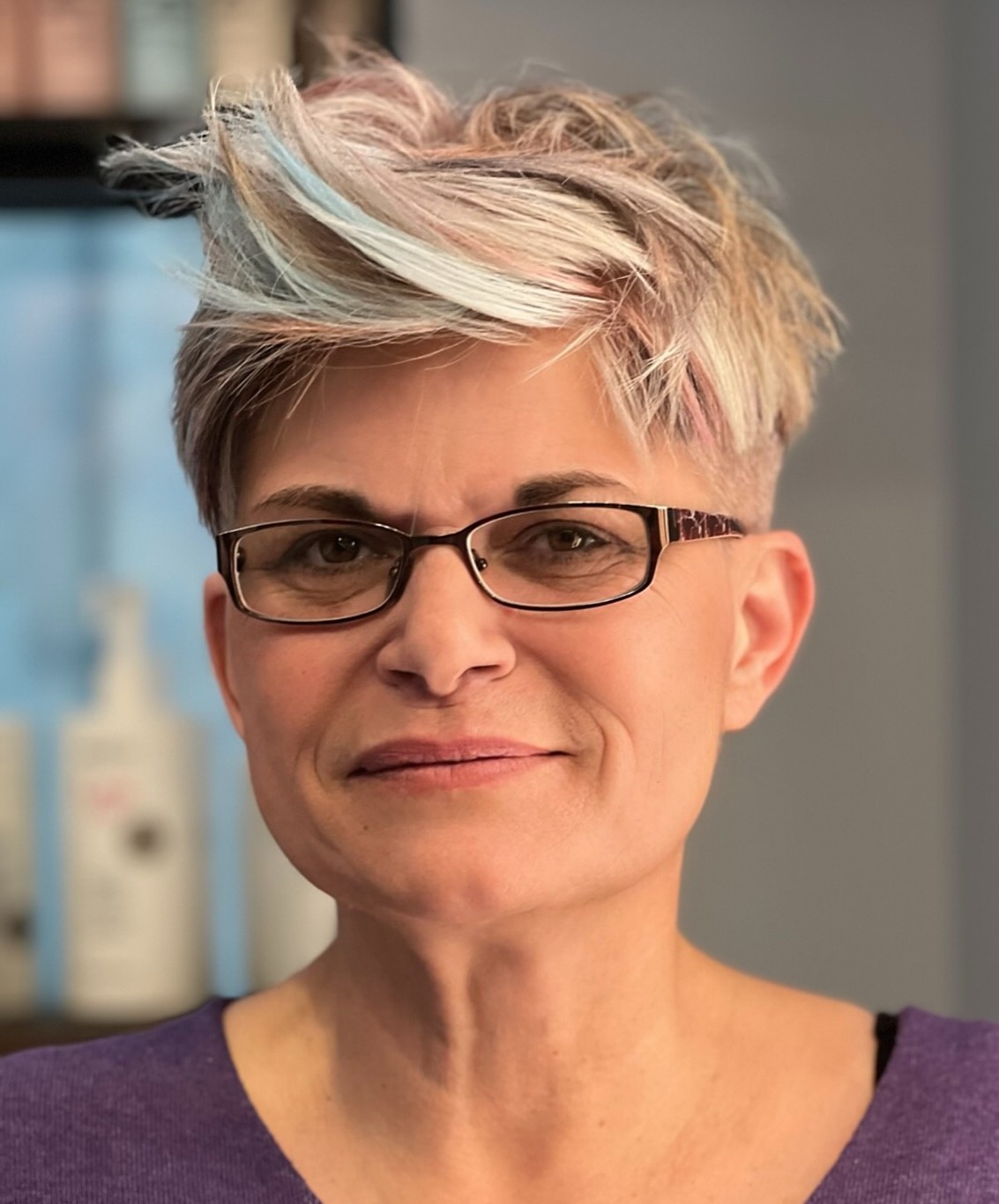 A tousled top and a tapered back are the mainstays of well-structured pixies because this combo is youthful and easy to style. The long, silver-gray highlights can match in color with your frames and help to make a fashion statement.