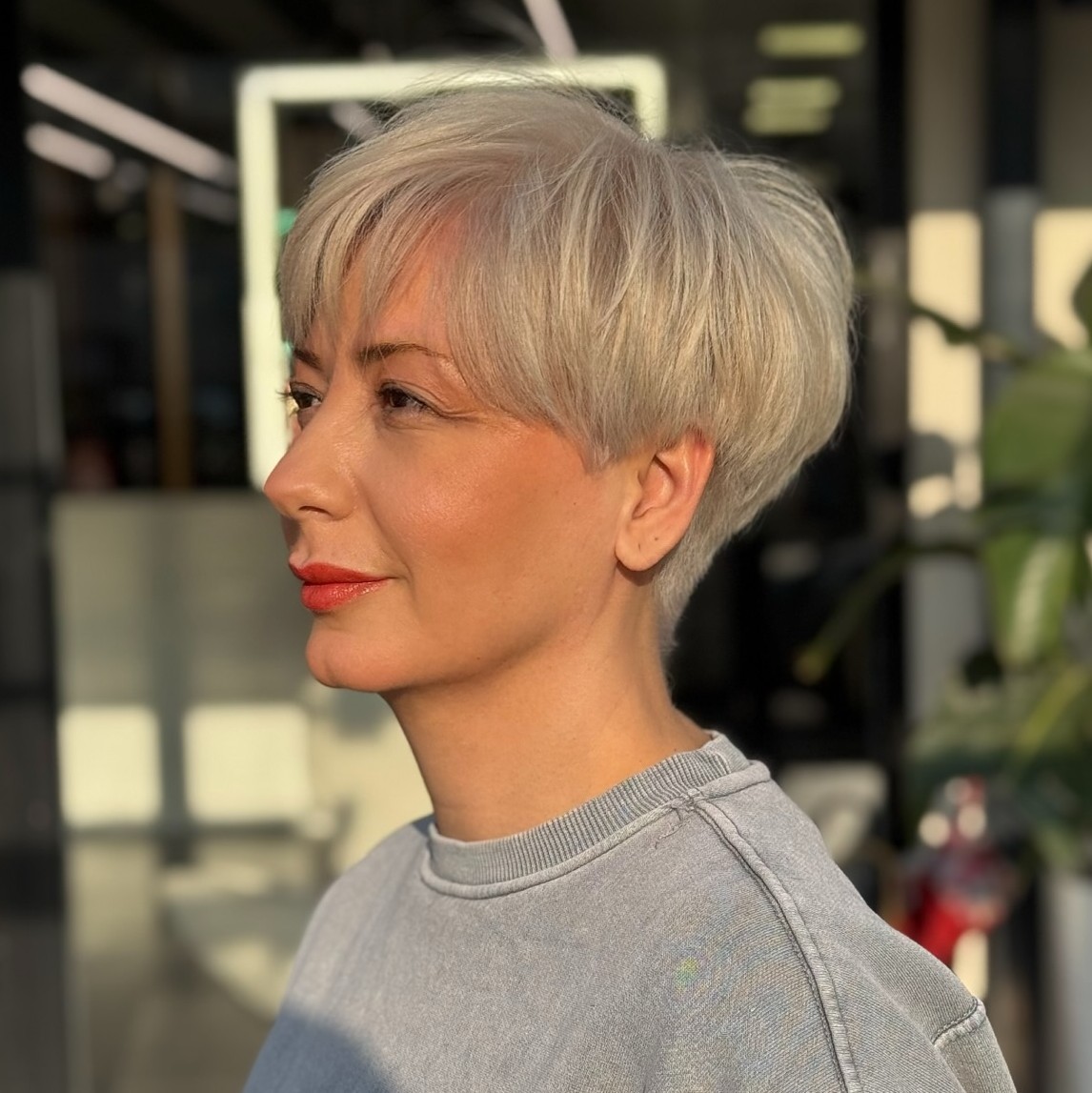 Also, rethink your color and styling. Balayage and two-toned colorings can help brighten the complexion. If you have transitioned to your natural gray, consider enhancing it with silver blonde highlights or dark gray lowlights. When it comes to styling, defined layers, as well as a spiky or swept-back top, work like magic. Check the images with short crops below and save the ideas you love the most.